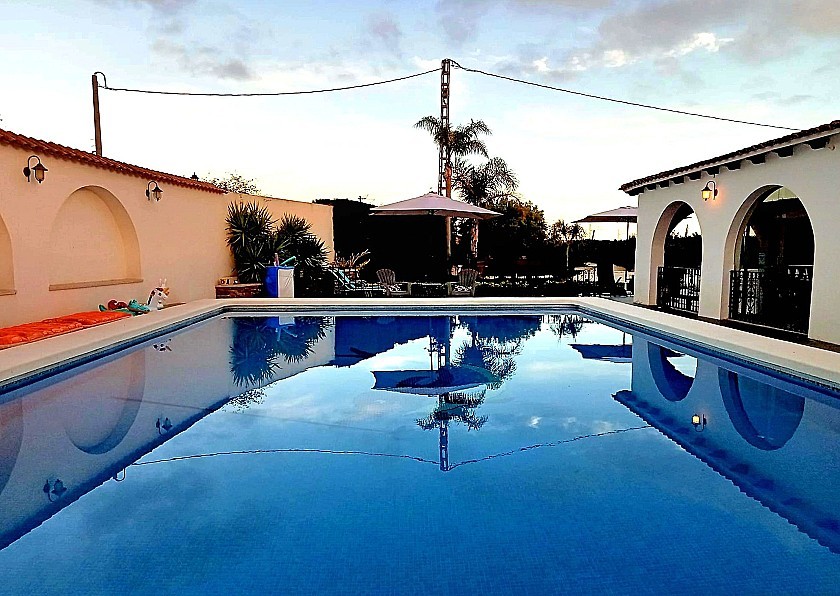 Ein privater Swimmingpool mit großzügigen Sonnenterrassen und Außendusche.