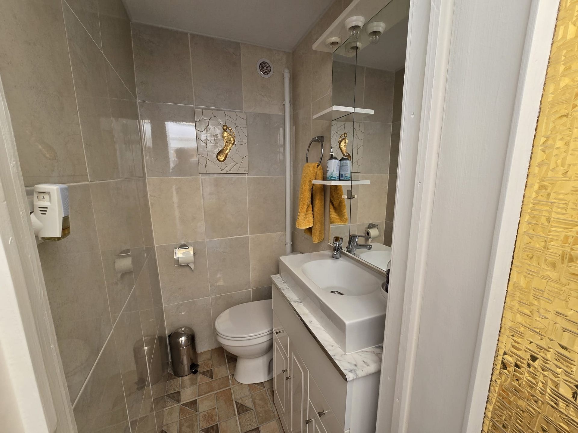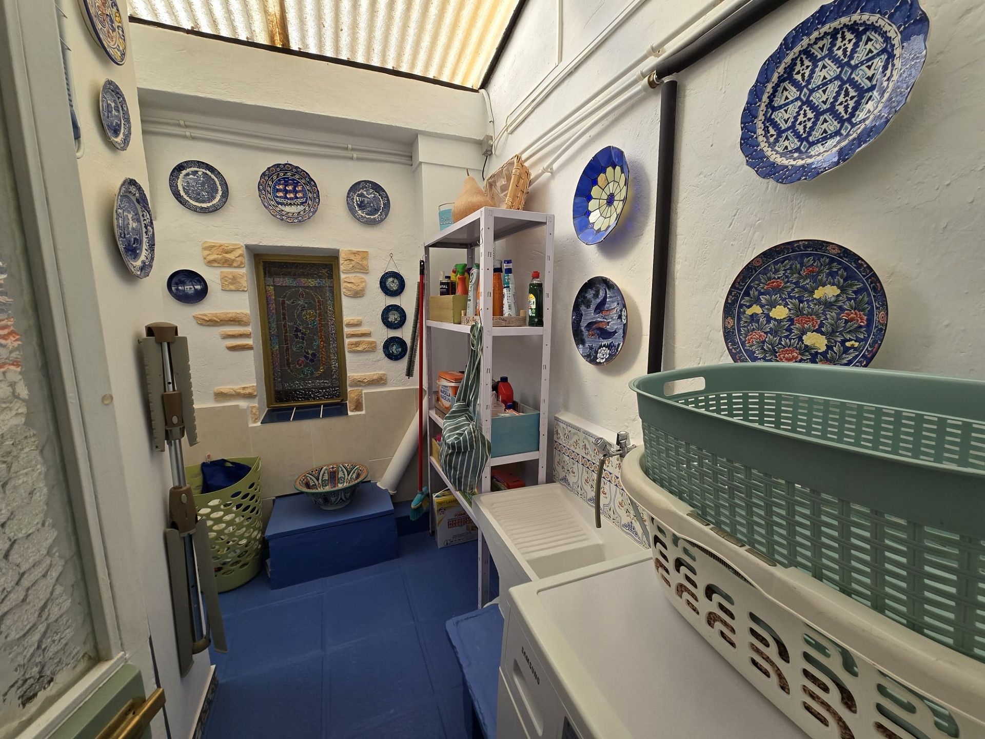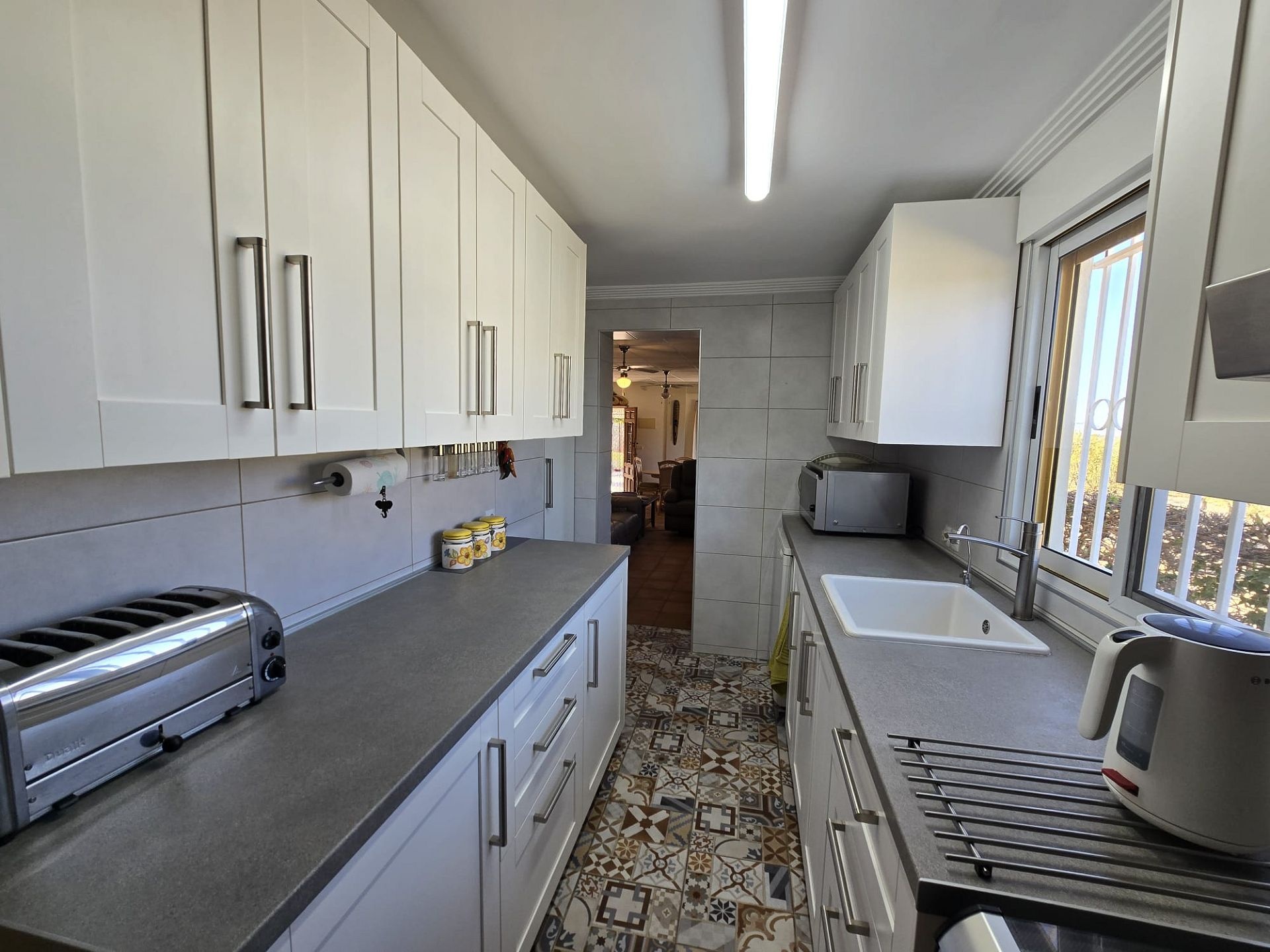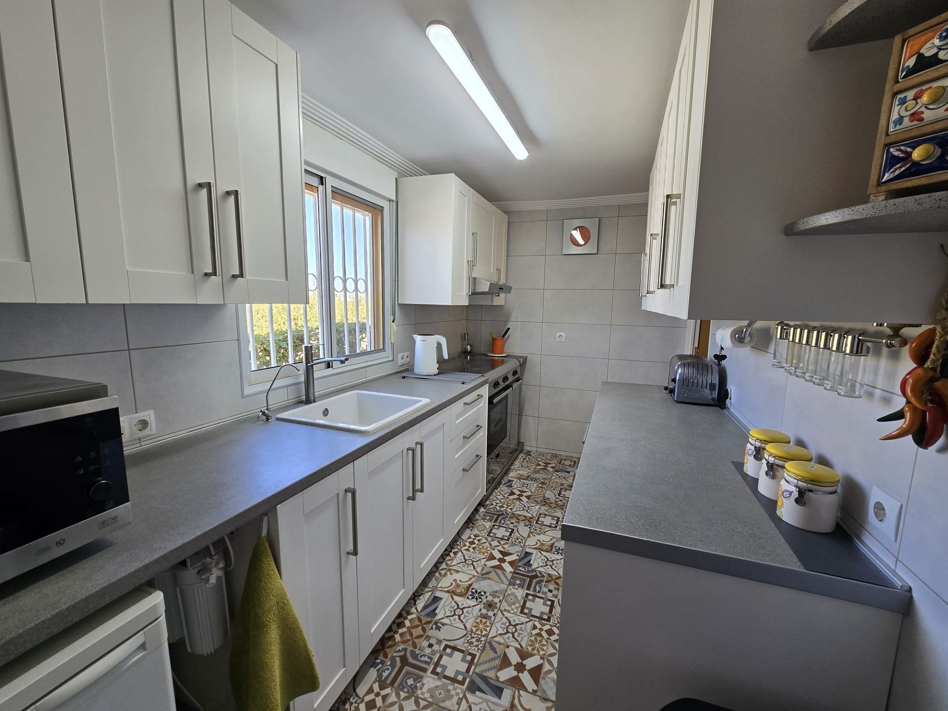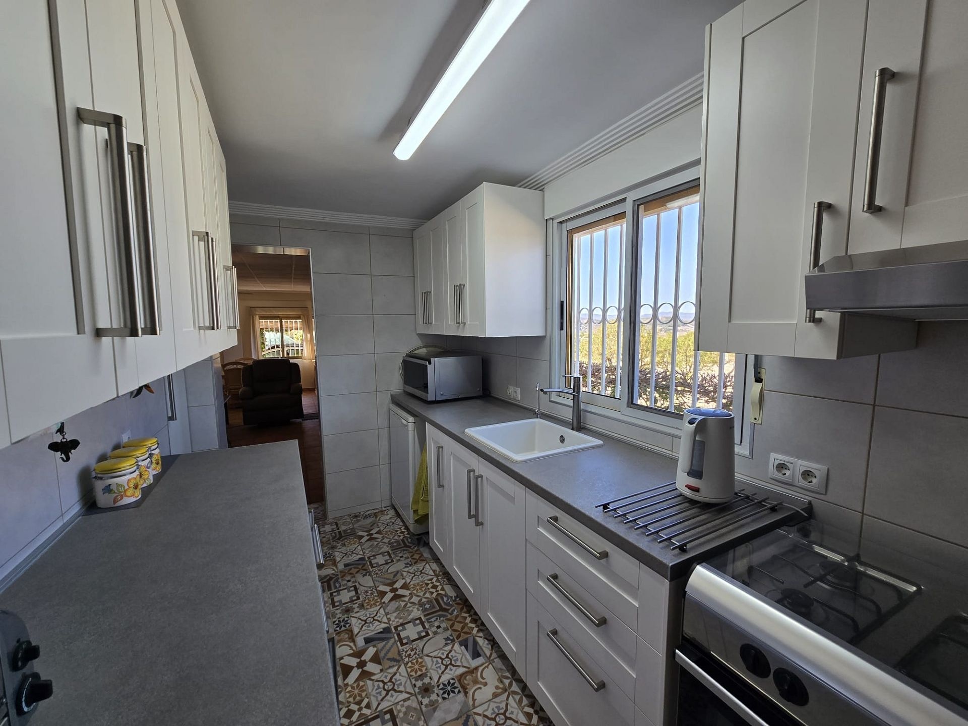 Von hier aus gelangt man in die Garage/Werkstatt mit einem 300-Liter-Wassertank und anschließend in die große, voll ausgestattete Küche mit direktem Zugang zum Garten und Poolbereich. Dort befindet sich auch ein weiteres Badezimmer.