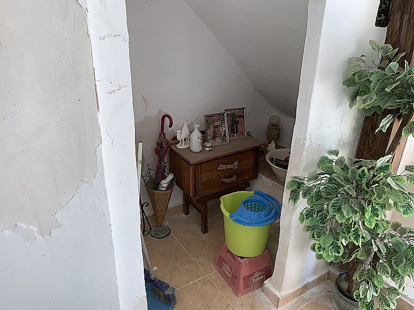 Die Eingangstür des Hauses ist das erste Highlight: Eine riesige, dicke Holztür mit großen schwarzen Nieten und einem Schlüssel im Kirchenstil prägt den Charakter dieses authentisch spanischen Anwesens. Von der Eingangshalle aus gelangt man in den ersten Stock und darunter in einen kleinen Abstellraum. Die Treppe führt über ein schönes Holzgeländer in die nächste Etage. Von hier aus gelangt man in das schön geflieste Badezimmer mit ebenerdiger Dusche.
