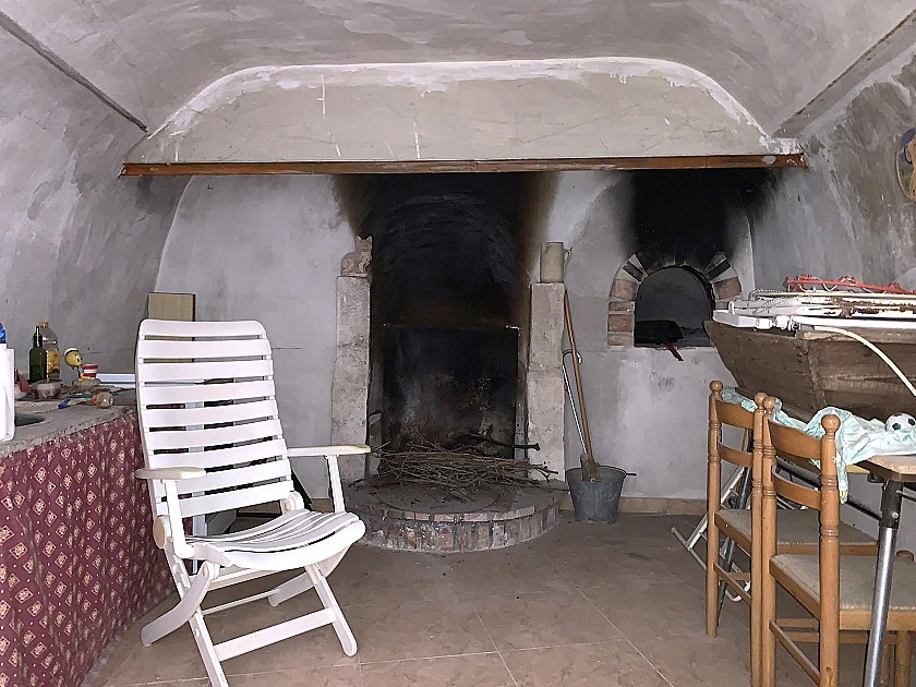 Unter dem Holzbalken gelangt man in den Wohnbereich. Im hinteren Teil des Hauses befindet sich ein kleines Schlafzimmer. Links davon befindet sich die Küche. Diese verfügt über eine Spüle auf der linken Seite, einen großen Grillbereich und einen separaten Brot- und Pizzaofen. An die Küche schließt sich ein Abstellraum an.