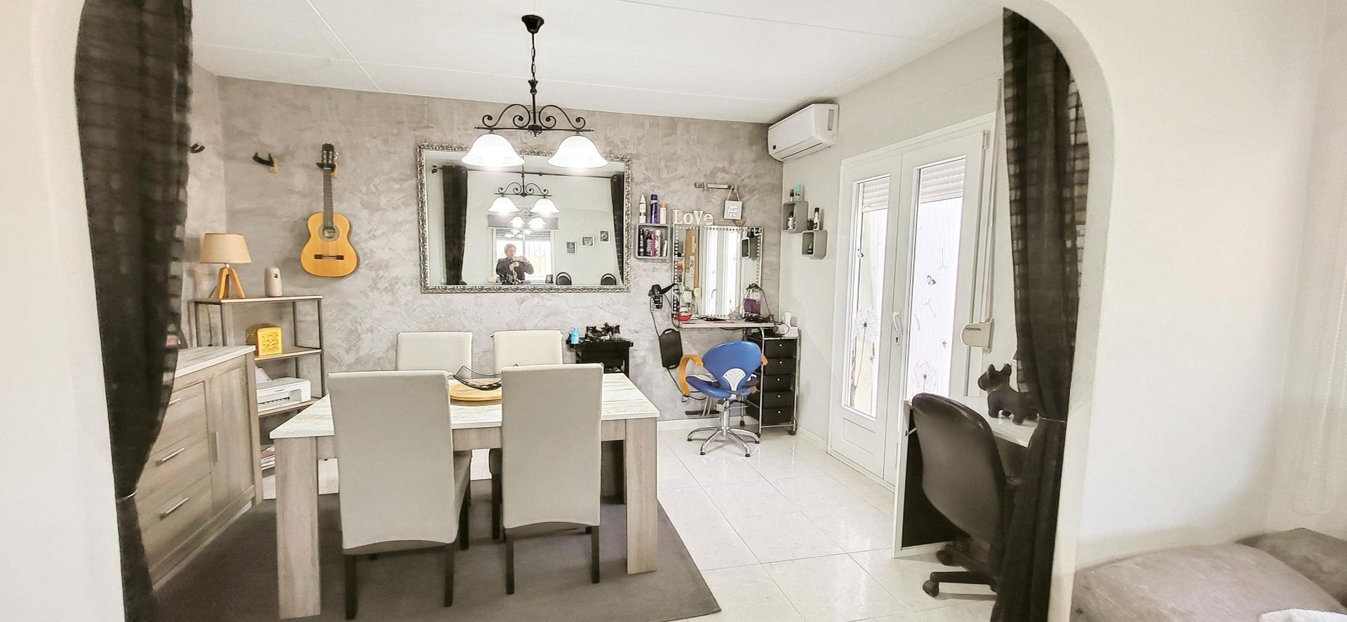The spacious living room benefits from abundant natural light, enhanced by double-glazed windows that provide excellent temperature control and sound insulation. A pellet burner adds efficient, comforting warmth during the cooler months, while air conditioning in every room ensures year-round comfort.