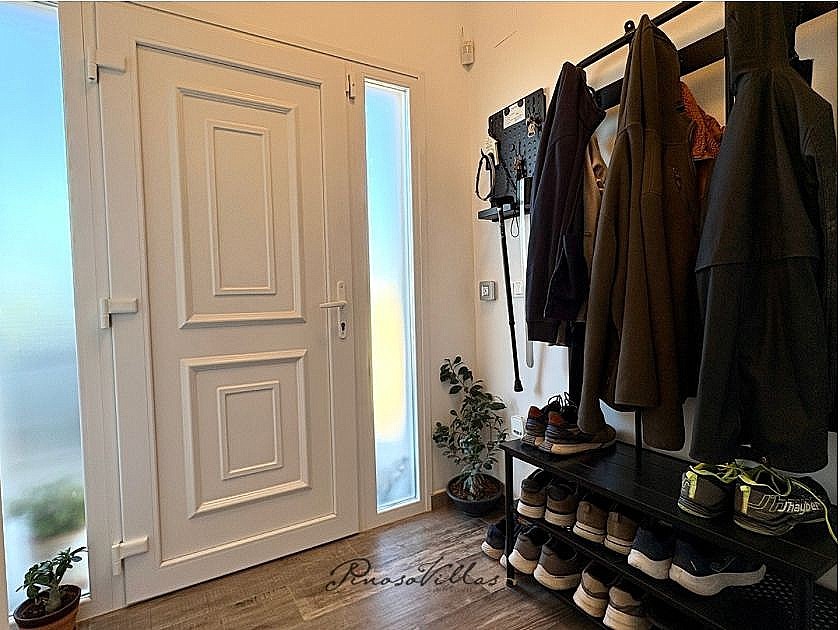 The living area is beautifully furnished and includes a nice pellet burner, perfect for cozy winter evenings. From here, a door leads to the main entrance, which includes a convenient space for coats and shoes and provides access to the front of the house.