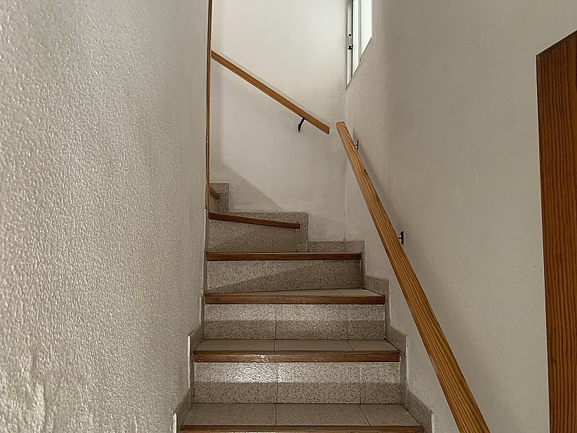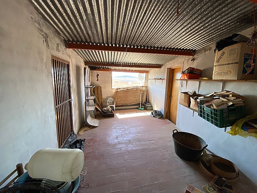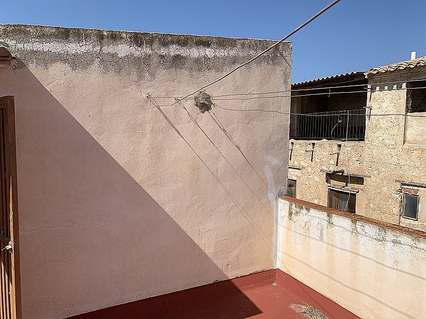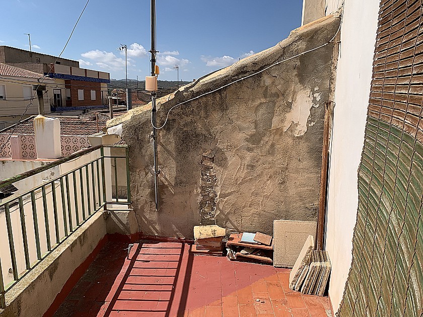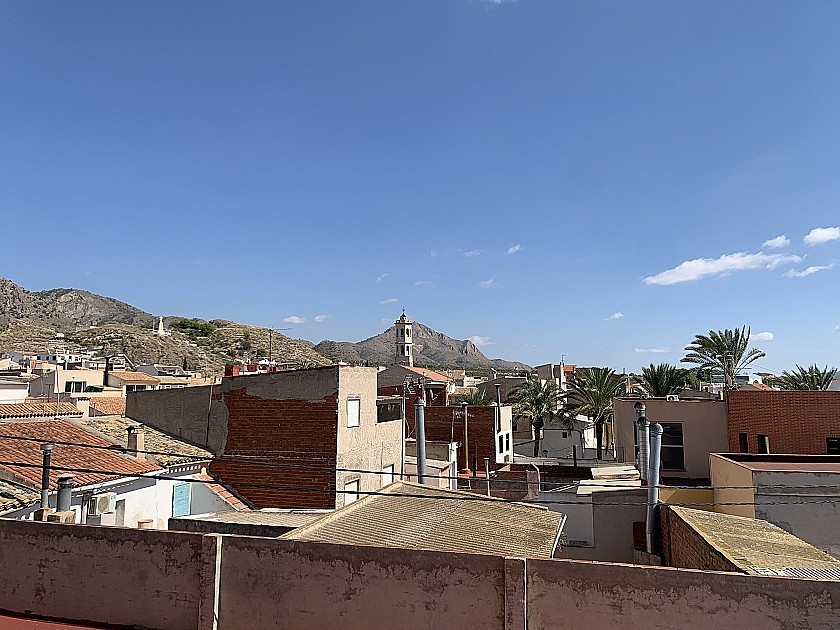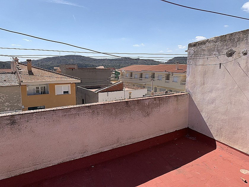 The stairs in the open area lead to the second floor, which is one large room, with a doorway leading to a 20m2 patio area, with views again across the town and the mountains behind.