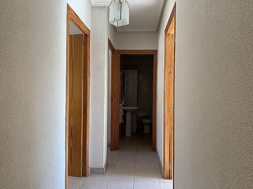 The stairs here take us up to the first floor, where we have a large open room, with a hallway leading to three further bedrooms and a bathroom. From the other side of the open area, we have another bedroom which has a small balcony with views across the town and the countryside behind. The hallway behind leads to the last two bedrooms.
