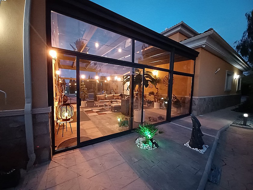 Entre la maison et l'annexe se trouve une grande pièce vitrée (véranda) de plus de 60 m2 qui est traitée avec un verre anti-UV pour éviter la chaleur, donc un espace idéal pour se divertir en été ou en hiver.
