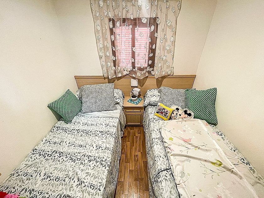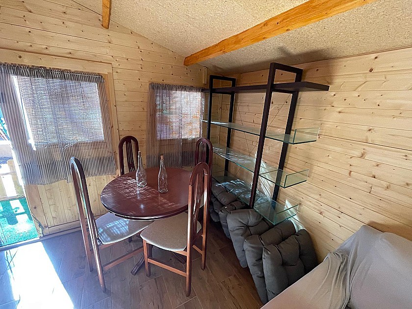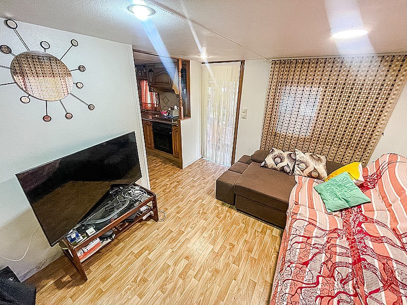 De hoofdwoning beschikt over twee slaapkamers en een complete badkamer, waardoor een gezellige en goed ingedeelde leefruimte ontstaat. De woonkamer heeft een open haard, die warmte en een aangename sfeer biedt tijdens de koelere maanden. De keuken is praktisch en licht, ontworpen om de beschikbare ruimte optimaal te benutten.